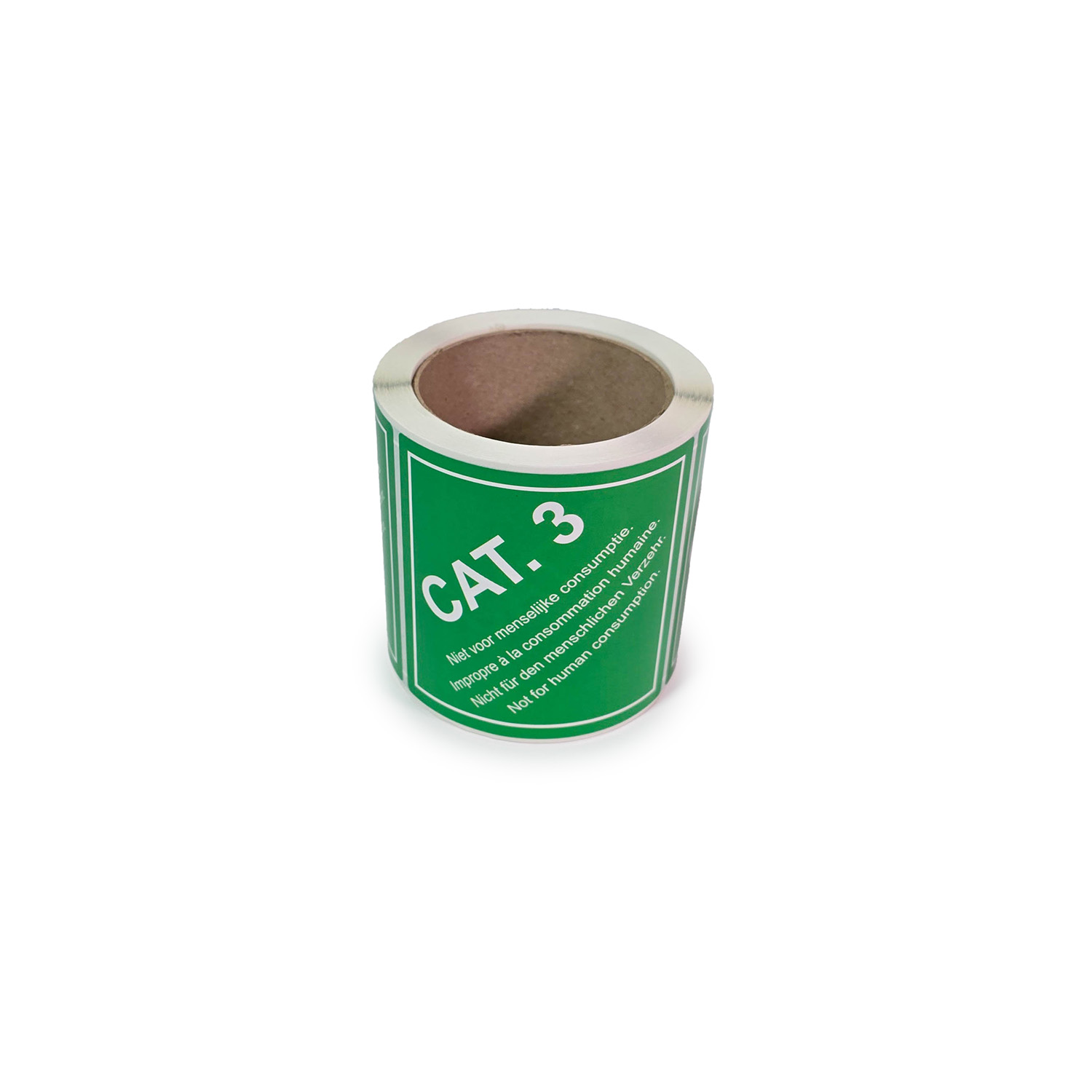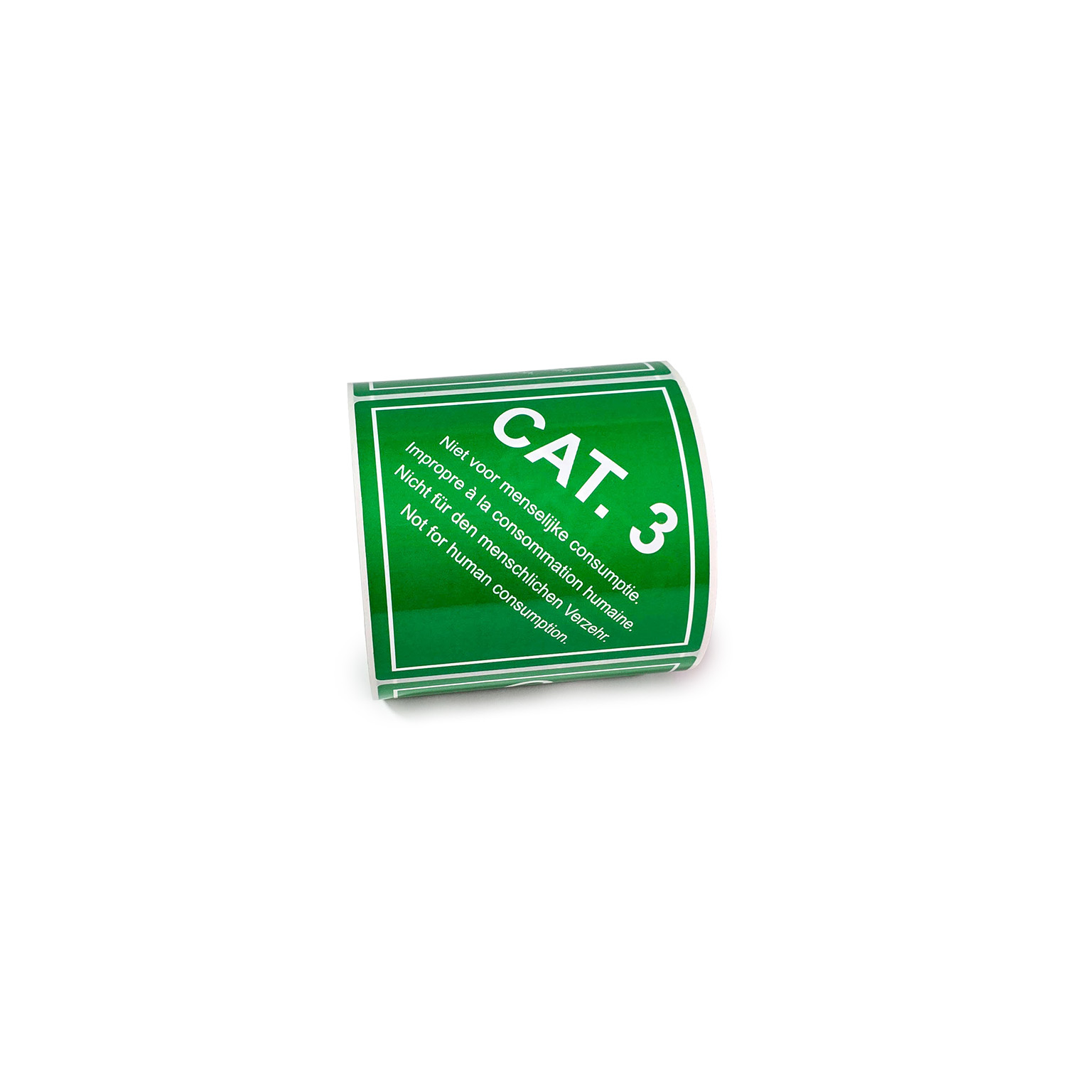• Ontwerp: Vierkant pictogram met de tekst CAT. 3 – niet voor menselijke consumptie in vier talen op een groene achtergrond.
