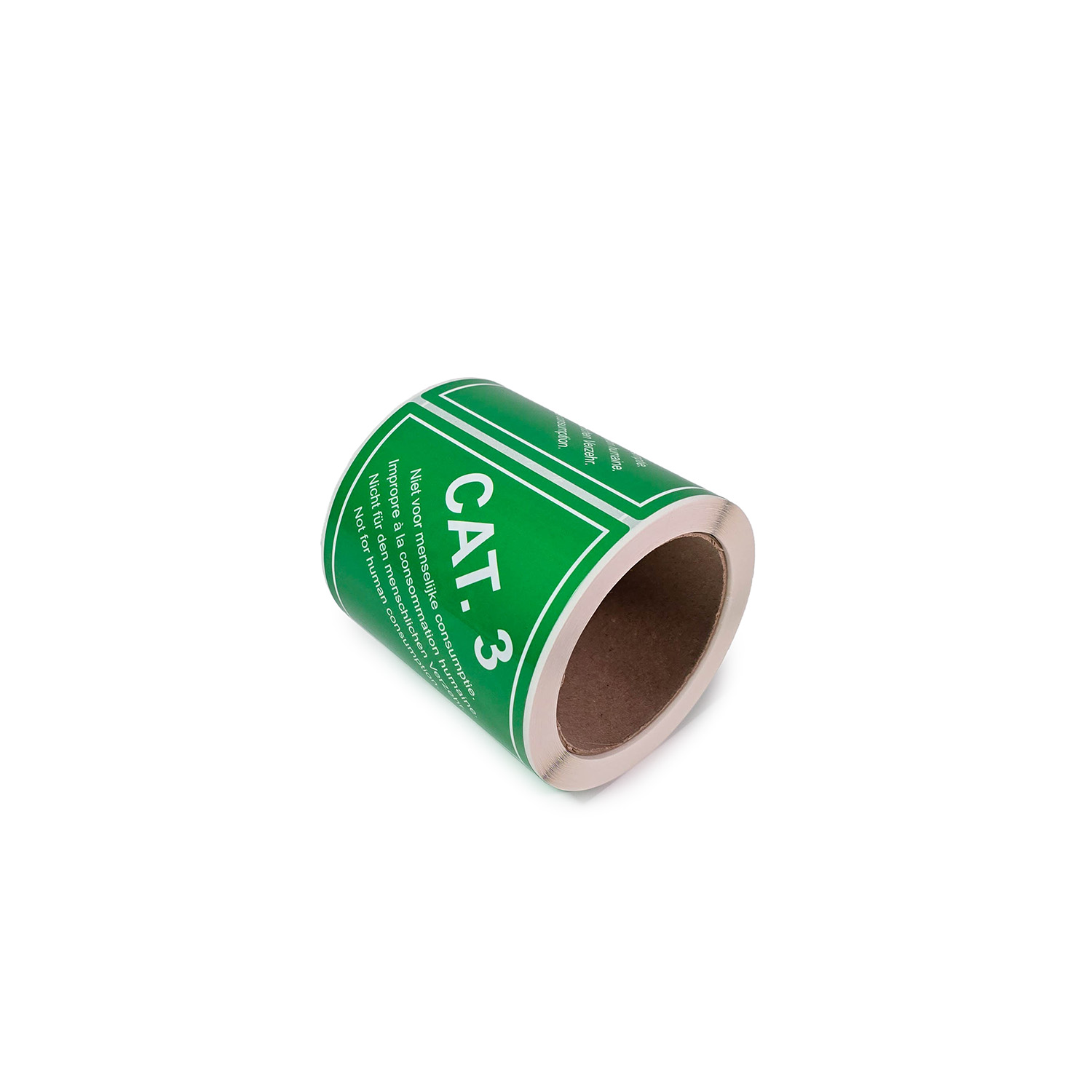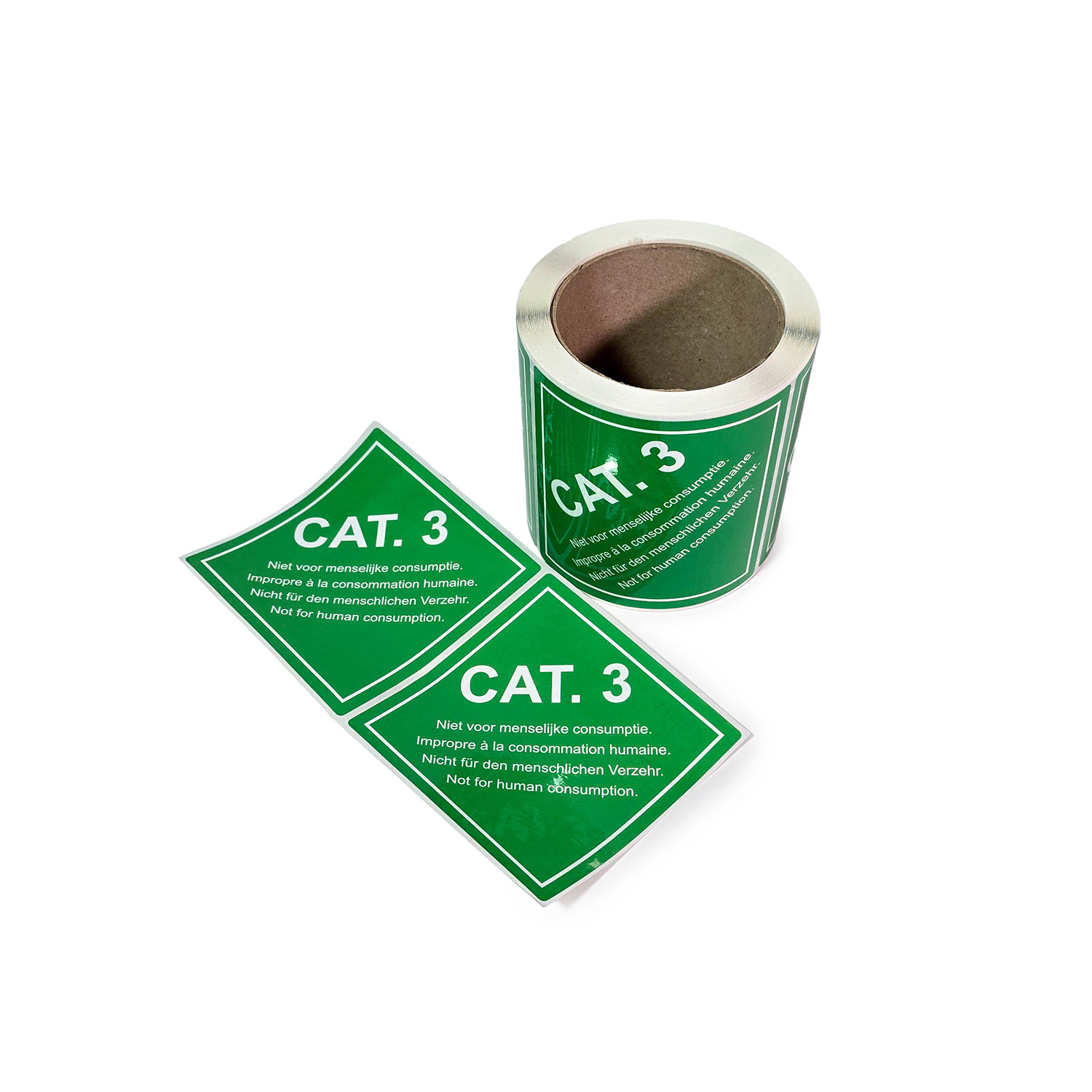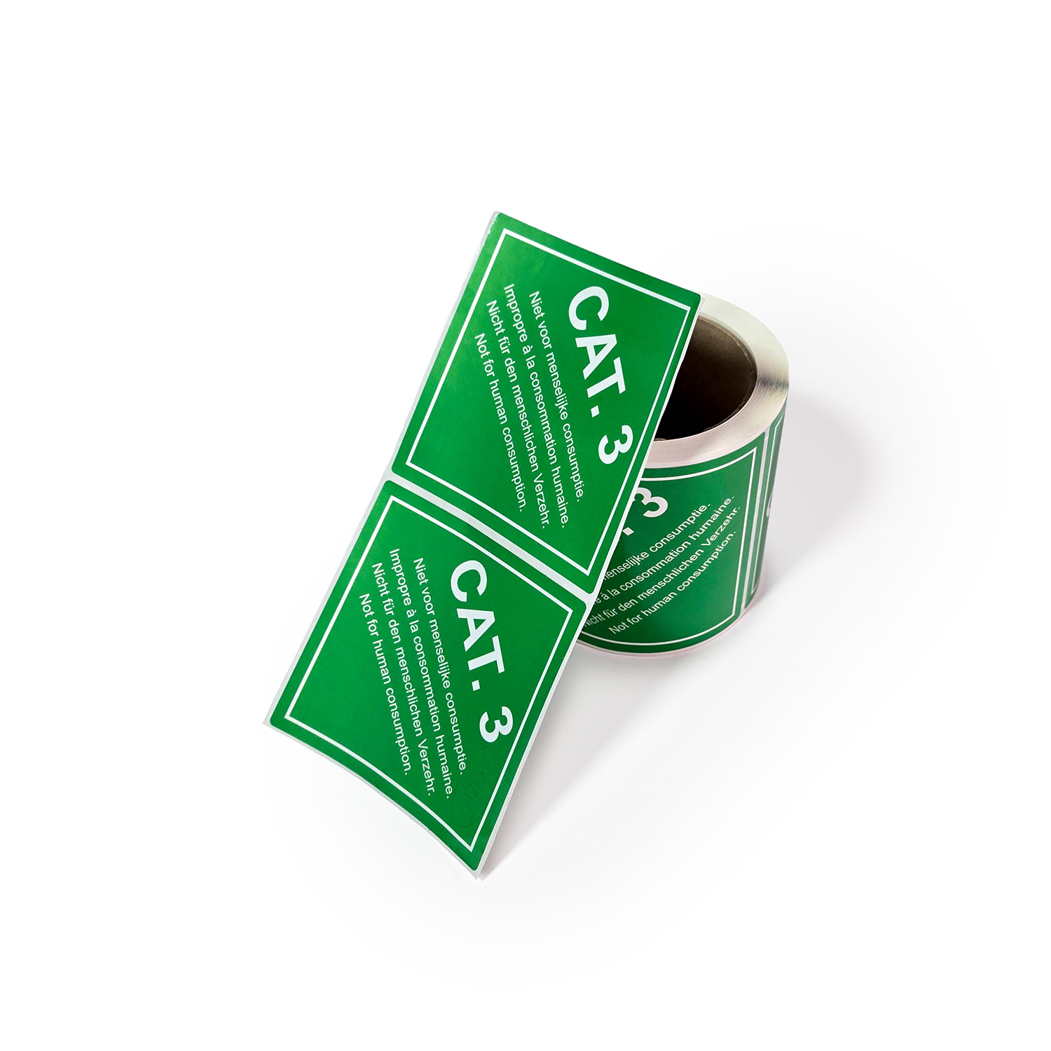 De stickers zijn uitgevoerd in groen met witte tekst en voorzien van de aanduiding “CAT. 3 – niet voor menselijke consumptie” in vier talen.